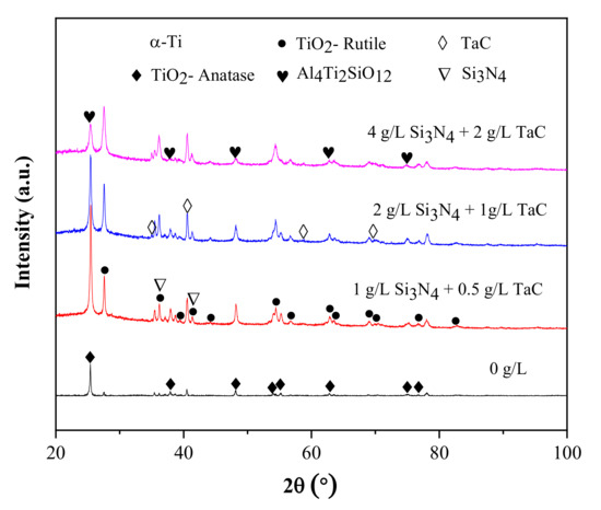- The phase constituents of the composite MAO coatings with different contents of Si3N4/TaC particles were mainly composed of anatase TiO2, rutile TiO2, TaC, Si3N4, and Al4Ti2SiO12. By increasing the concentration of the Si3N4/TaC particles, the peak intensity of rutile TiO2 and TaC gradually increased, and the content of the metastable anatase-TiO2 decreased.