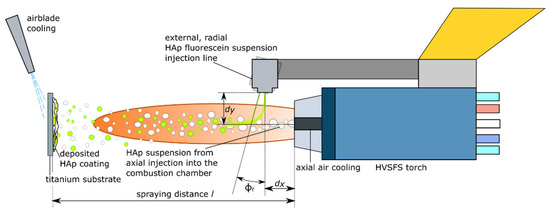 In this work, we used a HVSFS process with a combination of one axial and one radial injection line. This configuration has been used in advance for the deposition of thermally sensitive AlN coatings [25]. In general, this setup offers new possibilities in depositing complex material systems. In our example, a hydroxyapatite matrix is sprayed through the axial injection of an aqueous hydroxyapatite suspension into the combustion chamber. The temperature-sensitive model drug suspension was radially injected to shorten the interaction time between flame and organics.