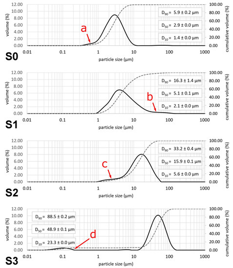 Particle size distributions of the suspensions S0 to S3 used in the coating process, particular sections of the curves highlighted by arrows and named.