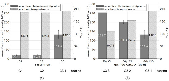 In a second experiment, the gas mass flow was varied at three different levels (see Figure 6b). Spraying suspension S3 at varied gas mass flows and consequently varied flame energies leads to different superficial substrate temperatures. These temperatures increase with increasing gas mass flow due to the higher flame enthalpy. Accordingly, the MFI value shows a correlation reciprocal to the surface temperature of the substrate. The coating sprayed at lowest enthalpy, showing the lowest heating of the substrate, preserves the highest content of active fluoresceine. Consequently, this coating shows the highest mean fluorescence intensity.