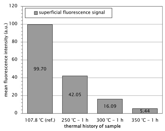 To investigate the decomposition behaviour of fluoresceine, the sample C3-3 with the highest fluorescence intensity after coating was thermally aged at different temperature conditions. A continuous decrease of the MFI signal of the specimen’s surface is detectable with increasing aging temperatures (Figure 7). At 250 °C aging temperature, the fluorescence intensity has lowered by more than the half compared to the unaged coating C3-3.