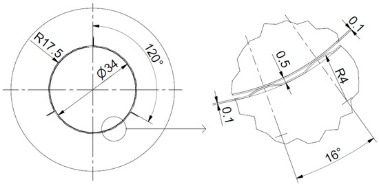 The object of investigation is a gas foil bearing with a nominal diameter of 34 mm and a width of 40 mm (Figure 3a). The foil bearing has a single top foil and three bump foils spaced along its perimeter. All foils are fixed to the bearing sleeve using grooves (with angular increments of 120°). Each bump foil has seven bumps that are evenly spaced along the curvature of the bearing sleeve. The geometry of the bump foil was obtained using an original manufacturing method employing 3D printed tools [52]. Each bump foil is also divided into four sections across the width of the bearing. The top foil and the bump foils were made of a nickel-based superalloy—Inconel Alloy 625. The inner side of the top foil, which is in contact with the journal, has a wear-resistant anti-friction coating (Figure 3b) made of a specially selected polymer (polytetrafluoroethylene-based material). The selected coating material has the trade designation AS20 and is characterized by a low coefficient of friction (the static friction coefficient is 0.1, and the kinetic friction coefficient is 0.04 [46]), high abrasion resistance and a maximum operating temperature of 280 °C. The thickness of the protective coating on the top foil is between 10 to 15 µm. This coating is necessary to protect the top foil during run-ups and run-downs. The basic dimensions of the bearing are shown in Figure 4, and its main technical parameters are summarized in Table 1.