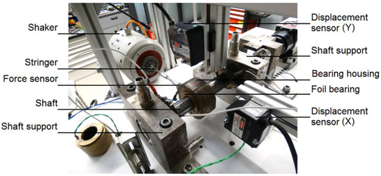 The experimental tests were carried out using a test rig dedicated to determining the dynamic characteristics of a foil bearing structure. The bearing sleeve was placed inside a housing (with a mass of 950 g) which was connected via a stringer (with a diameter of 5.5 mm and a length of 160 mm) with an electromagnetic shaker. The shaft with the bearing journal was held in place by two supports, as shown in Figure 5. Bearing sleeve displacements were measured using a high-precision laser sensor (Keyence LK-H050, Osaka, Japan) with a measurement range of ±10 mm, linearity of ±0.02 and repeatability of 0.025 µm, which was connected to an LK-G5001 controller. The resolution of the displacement measurement was set to 0.1 µm. Dynamic excitation was generated by an electromagnetic vibration exciter (TIRA TV 51110, Schalkau, Germany) with a rated peek force of 100 N, a frequency range of 2–7000 Hz and a maximum peak-to-peak displacement of 13 mm. The excitation force was adjusted individually for each series of measurements using an amplifier (TIRA BAA-120, Schalkau, Germany), whose signal-to-noise ratio is greater than 95dB and distortion is greater than 0.05%, so as to obtain amplitude values on the desired level. During the experimental tests, the actual force generated by the shaker, which acted on the bearing, was measured using a mechanical impedance sensor with a quartz sensing element (PCB Piezotronics 288D01, Depew, NY, USA), with a measurement range of ±222.4 N and non-linearity of ±1%. The impedance sensor was mounted between the stringer and the bearing housing. A multichannel analyser (LMS SCADAS Mobile 05, Leuven, Belgium) with dedicated software (LMS Test. Lab 11B, Leuven, Belgium) was used as the data acquisition system. Figure 5 shows a picture of the test rig, taken during the foil bearing test.