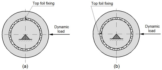 Two foil bearing configurations used in the research: (a) Load acting in the direction perpendicular to the sleeve groove where the top foil was fixed; (b) Load acting in the direction parallel to the sleeve groove.