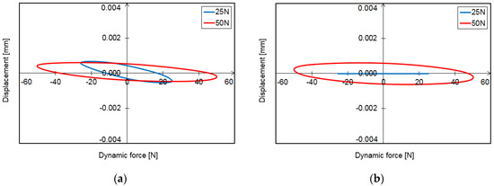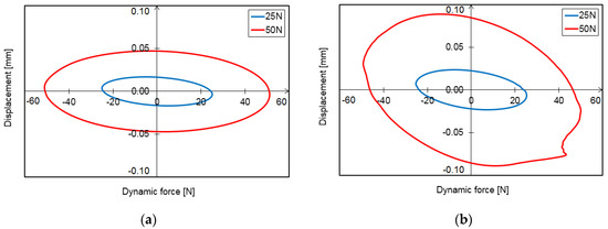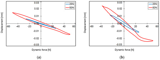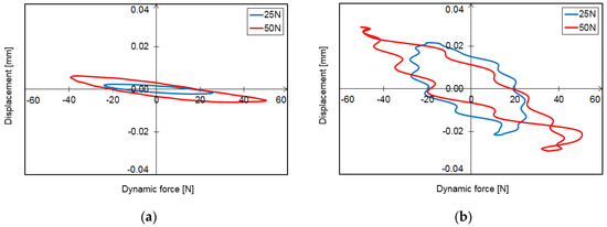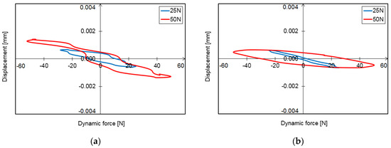 Figure 8 shows the hysteresis loops obtained at an excitation frequency of 40 Hz. Even at first glance, it is clear that the characteristics have changed significantly compared to the results obtained at a frequency of 20 Hz. The major axes of the resulting loops pass through the second and fourth quadrants of the coordinate system, and although the range of displacements on the abscissa axis has been significantly reduced (from 0.1 mm to 0.03 mm), the loops are significantly flattened. At a load of 25 N, the maximum displacement for each loading method was 0.0064 mm (Figure 8a) and 0.0116 mm (Figure 8b), respectively, representing an 81% increase. At a load of 50 N, the displacements were 0.0147 mm (Figure 8a) and 0.0240 mm (Figure 7b), respectively. Therefore, the percentage increase was 63%. Besides the change in vibration amplitude, some changes in the shape of the loops were also observed.