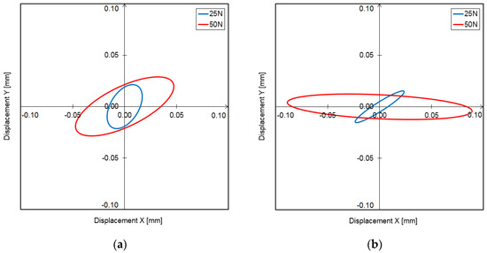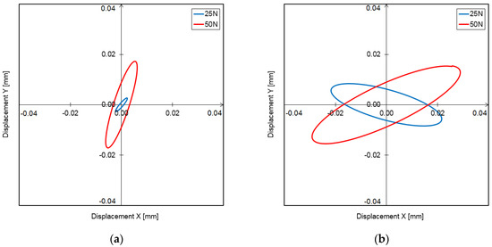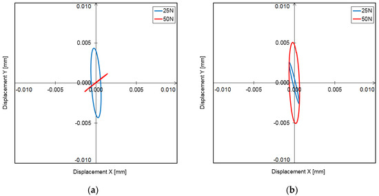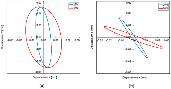 It Is therefore clear that the following characteristics, shown in Figure 14, confirm the above statement. A twofold increase in excitation frequency caused a considerable change in the shapes of the obtained loops, and when the bearing sleeve was rotated by 90°, there were also, in this case, large differences between the results shown in Figure 14a,b. In the first configuration, the maximum displacements in the X and Y directions were as follows: 0.0023 mm and 0.0027 mm, respectively, for 25 N; 0.0062 mm and 0.0171 mm, respectively, for 50 N. Then, in the second configuration, the results were as follows: 0.0217 mm and 0.0084 mm, respectively, for 25 N; 0.0289 mm and 0.0155, respectively mm for 50 N. Although the hysteresis loop obtained for the second orientation variant, shown in Figure 9b, has an irregular shape, the vibration trajectory shown in Figure 14b, obtained during the same series of measurements, has a regular shape. As noted earlier, the irregular shape of the hysteresis loop may occur due to fluctuations in the value of the measured force (this parameter has not been taken into account in Figure 14b).