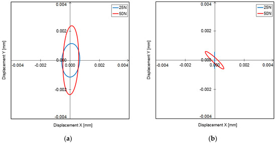 Figure 13 shows the results obtained using an excitation frequency of 40 Hz. In Figure 13a, it can be seen that in two load cases, the maximum displacements in the X direction were smaller than those in the Y direction (0.0064 mm and 0.0245 mm, respectively, for 25 N; 0.0147 mm and 0.0252 mm, respectively, for 50 N). Interestingly, in both cases, the displacement in the direction perpendicular to the direction of the acting force was very similar, about 0.025 mm. As for the load variant whose results are shown in Figure 13b, it can be observed that the obtained loops have a similar shape; however, the major axis of the loop obtained with a higher load is more inclined towards the X-axis. The maximum displacements from the equilibrium position in the directions of the X and Y axes are as follows: 0.0116 mm and 0.0169 mm, respectively, for 25 N; 0.0240 mm and 0.0089 mm, respectively, for 50 N. This example clearly demonstrates that the position where the foil is mounted relative to the direction of the acting load has a very strong influence on the vibration trajectories.