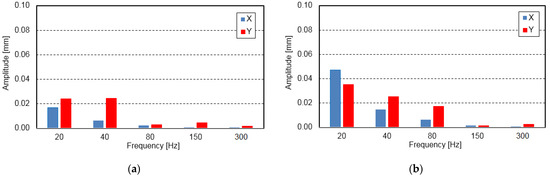 Summary of the amplitudes of sleeve displacements in two directions versus the frequency of the excitation force that acted in the direction perpendicular to the sleeve groove: (a) for a load of 25 N; (b) for a load of 50 N.