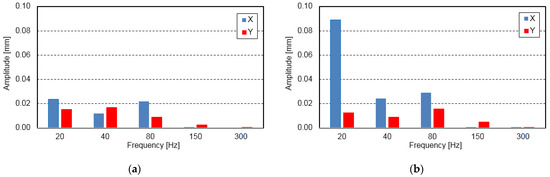 Summary of the amplitudes of sleeve displacements in two directions versus the frequency of the excitation force that acted in the direction parallel to the sleeve groove: (a) for a load of 25 N; (b) for a load of 50 N.