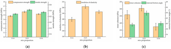 As can be seen from Figure 4a, the compression strength of slurries with mix proportion 3:1:6, 3:2:5, and 3:3:4 is 1.48, 1.575, and 1.524 MPa; the tensile strength is 0.229, 0.243, and 0.235 MPa. As can be seen from Figure 4b, the modulus of elasticity of slurries with mix proportion 3:1:6, 3:2:5, and 3:3:4 is 180, 202, and 193 MPa. As can be seen from Figure 4c, the inner cohesion of slurries with mix proportion 3:1:6, 3:2:5, and 3:3:4 is 232, 241, and 215 kPa; the internal friction angle is 39.65°, 43.92°, and 40.12°. The slurry with 3:2:5 has the maximum of the all mechanical properties. It is obvious that the mechanical properties of the slurry with mix proportion 3:2:5 are the best.