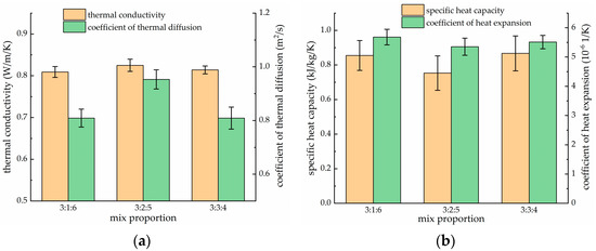 Figure 5a,b show the results of thermal test for slurries. The thermal conductivity of slurries with mix proportion 3:1:6, 3:2:5, and 3:3:4 is 0.809, 0.825, and 0.814 W/m/K; the coefficient of thermal diffusion is 0.809, 0.953, and 0.809 m2/s. The specific heat capacity of slurries with mix proportion 3:1:6, 3:2:5 and 3:3:4 is 0.855, 0.753, and 0.867 kJ/kg/K; the coefficient of heat expansion is 5.68 × 10−6, 5.35 × 10−6, and 5.51 × 10−6 1/K. Overall, high thermal conductivity and coefficient of thermal diffusion and low specific heat capacity of the slurry with mix proportion 3:2:5 could reduce heat accumulation, and low coefficient of heat expansion could reduce the heat deformation.