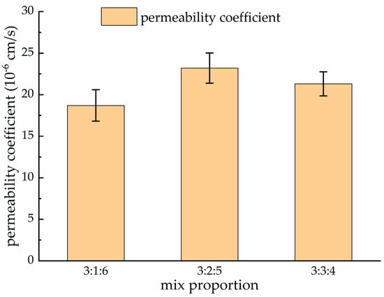 As can be seen from Figure 6, the permeability coefficient of slurries with mix proportion 3:1:6, 3:2:5 and 3:3:4 is 18.7 × 10−6, 23.2 × 10−6 and 21.3 × 10−6 cm/s. The slurry with 3:2:5 has the maximum of the permeability coefficient. After being soaked for enough time, the mass of all slurries does not change and the disintegration does not occur. So, the disintegration rate of three slurries is 0 g/min.