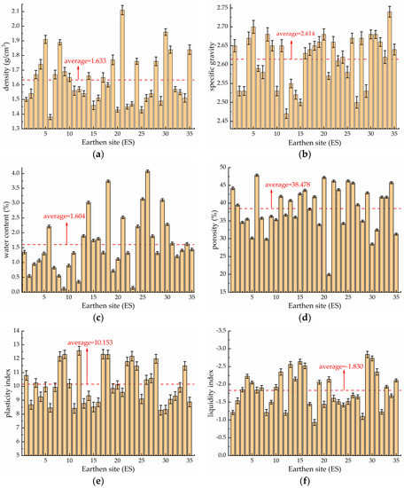 As can be seen from Figure 7, the maximum and minimum of the density of 35 site soils is 2.11 g/cm3 and 1.38 g/cm3, and the average (marked with the red dashed line and the red arrow and text in Figure 7a) is 1.633 g/cm3; the maximum and minimum of the specific gravity of 35 site soils is 2.74 and 2.47, and the average (marked with the red dashed line and the red arrow and text in Figure 7b) is 2.614; the maximum and minimum of the water content of 35 site soils is 4.07% and 0.12%, and the average (marked with the red dashed line and the red arrow and text in Figure 7c) is 1.604%; the maximum and minimum of the density of 35 site soils is 47.87% and 19.92%, and the average (marked with the red dashed line and the red arrow and text in Figure 7d) is 38.478%; the maximum and minimum of the plasticity index of 35 site soils is 12.57 and 8.28, and the average (marked with the red dashed line and the red arrow and text in Figure 7e) is 10.153; the maximum and minimum of the liquidity index of 35 site soils is −0.93 and −2.84, and the average (marked with the red dashed line and the red arrow and text in Figure 7f) is −1.830.