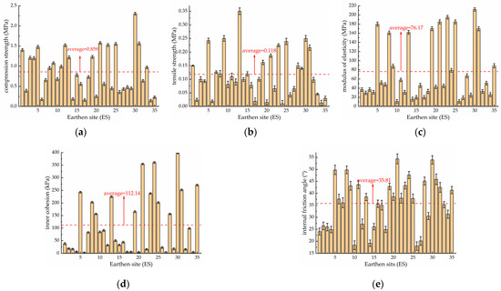 As can be seen from Figure 8, the maximum and minimum of the compression strength of 35 site soils is 2.303 and 0.146 MPa, and the average (marked with the red dashed line and the red arrow and text in Figure 8a) is 0.859 MPa; the maximum and minimum of the tensile strength of 35 site soils is 0.35 and 0.01 MPa, and the average (marked with the red dashed line and the red arrow and text in Figure 8b is 0.118 MPa; the maximum and minimum of the modulus of elasticity of 35 site soils is 212 MPa and 11 MPa, and the average (marked with the red dashed line and the red arrow and text in Figure 8c) is 76.17 MPa; the maximum and minimum of the inner cohesion of 35 site soils is 393 and 3 kPa, and the average (marked with the red dashed line and the red arrow and text in Figure 8d) is 112.14 kPa; the maximum and minimum of the internal friction angel of 35 site soils is 54.4° and 18°, and the average (marked with the red dashed line and the red arrow and text in Figure 8e) is 35.81°.