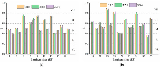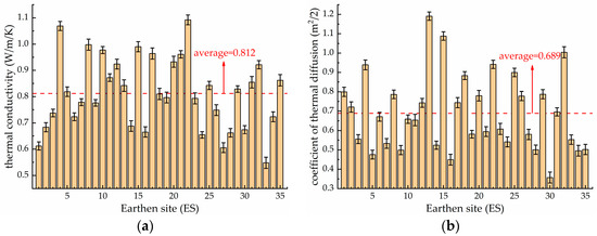 As can be seen from Figure 1, the maximum and minimum of the permeability coefficient of 35 site soils is 69.7 × 10−6 and 1.7 × 10−6 cm/s, and the average (marked with the red dashed line and the red arrow and text in Figure 10a) is 26.671 × 10−6 cm/s; the maximum and minimum of the coefficient of thermal diffusion of 35 site soils is 1.67 and 0.001 g/min, and the average (marked with the red dashed line and the red arrow and text in Figure 10b) is 0.353 g/min.