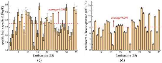As can be seen from Figure 9, the maximum and minimum of the thermal conductivity of 35 site soils is 1.092 and 0.548 W/m/K, and the average (marked with the red dashed line and the red arrow and text in Figure 9a) is 0.812 W/m/K; the maximum and minimum of the coefficient of thermal diffusion of 35 site soils is 1.190 and 0.357 m2/s, and the average (marked with the red dashed line and the red arrow and text in Figure 9b) is 0.689 m2/s; the maximum and minimum of the specific heat capacity of 35 site soils is 0.9813 and 0.4592 kJ/kg/K, and the average (marked with the red dashed line and the red arrow and text in Figure 9c) is 0.755 kJ/kg/K; the maximum and minimum of the coefficient of heat expansion of 35 site soils is 15.10 × 10−6 and 1.83 × 10−6 1/K, and the average (marked with the red dashed line and the red arrow and text in Figure 9d) is 8.29 × 10−6 1/K.