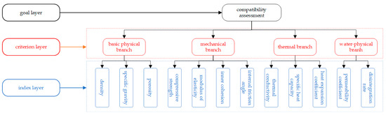 Compatibility assessment needs to select assessment indicators before transferring to a multi-criteria decision-making model (MCDM). There are fifteen indicators of all properties in the previous results, but some indicators are closely related and some are not important. So, twelve indicators are selected after careful consideration of importance and independence: density, specific gravity, porosity, compression strength, modulus of elasticity, inner cohesion, internal friction angle, thermal conductivity, specific heat capacity, coefficient of heat expansion, permeability coefficient and disintegration rate. The following is the detail.