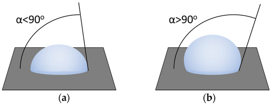 It is important to note that the content of zirconium butylate in the samples remained constant and amounted to 0.1% weight mass. The wetting contact angle, which characterizes the hydrophobicity of the surface and the degree of interaction of polluting liquids, suspensions and emulsions with the surface of the paint and varnish coating, was considered as the initial parameter [23]. When the wetting contact angle θ ≤ 90°, the surface is hydrophilic, which leads to rapid contamination of paint and varnish coatings because the contaminating liquid interacts better with the car surface. The hydrophobic surface is characterized by wetting contact angle θ > 90° [23]. When in contact with a hydrophobic surface, the contaminating liquid is quickly removed from the surface, keeping the car’s paint and varnish “clean” longer [24]. These types of surfaces are illustrated in Figure 2.