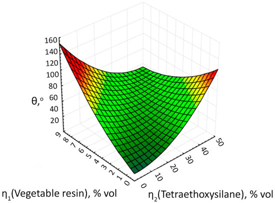 When analyzing the last response surface shown in Figure 22, it was found that the required wetting contact angle of more than 120° occurs at concentrations of tetraethoxysilane ≤ 18 vol.% and concentrations of titanium tetraisopropylate ≥ 2 vol.%