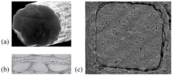 SEM images of (a) fiber (reprinted/adapted with permission from John Wiley and Sons, 2012 [42]); (b) 2D C/C composites (reprinted/adapted with permission from John Wiley and Sons, 2014 [44]); and (c) 3D C/C composites after ablation (reprinted/adapted with permission from Elsevier, 2017 [45]).