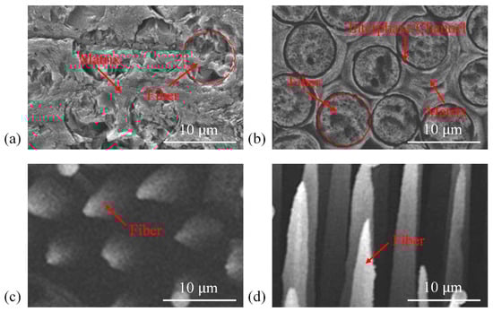 The reconstruction of the steady-state ablation morphology of carbon fibers has been described previously. Carbon matrix can also be reconstructed in the same way as carbon fibers. Figure 11a shows the SEM morphology of the C/C composites [31]. A simplified section of the fibers and matrix was established by observing the red rectangular area of the SEM morphology, as shown in Figure 11b. Figure 11c,d shows the C/C composite morphology and its equipotential map, according to calculation. In this model, the material and environmental parameters were the same as those described in Section 3.1: ηf = ηm = 20, χf = χm = 5 × 10−3 m. The calculation results were similar to the SEM morphology of C/C composites. The calculation time was 9.23 s. The characteristic lengths lc of the fibers and matrix were in the ranges of [2.60 × 10−6, 2.95 × 10−6] m and [4.78 × 10−7, 2.80 × 10−6] m, respectively. The numbers of fibers and matrix data reflected in the calculation results were 2527 × 31 and 3658 × 31, respectively. The maximum heights of the fibers and matrix were 5.86 × 10−5 m and 5.57 × 10−5 m, respectively. The morphology of the matrix showed obvious undulations because the characteristic lengths lc of the points in the matrix were different. Owing to the limited depth of field of SEM, only the red and yellow parts may be observed. However, according to the analysis of the steady-state ablation morphology (the maximum characteristic lengths and heights of the fibers and matrix are approximate), the reactivity of the fiber and matrix was approximated by observing the SEM morphology. Because the fibers were needle-shaped, the steady-state ablation morphology was limited by the reaction. In addition, according to Equation (9), the roughness Sa = 2.00 × 10−5 m. However, roughness is greatly affected by the material and environmental parameters. Thus, the roughness results can only be used as a reference. It is worth noting that the prediction of steady-state ablation morphology can guide the determination of ablation surface roughness to a certain extent when the material and environmental parameters are sufficiently accurate. The calculation results can have a guiding effect on the aerodynamic analysis of aircraft.