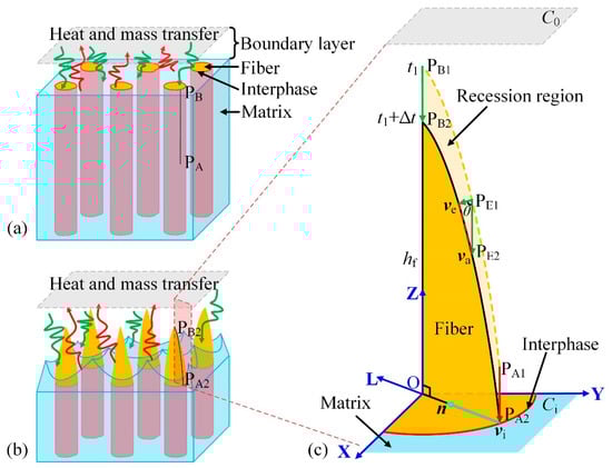 Considering the position of the fiber, i.e., vertical, inclined, or rotated around the axis, the steady-state ablation morphology was determined, which only changed with the coordinates. In steady-state ablation, the calculation can be significantly simplified using a morphology-control equation. To simplify the description of the model, we assumed that the fiber was an ideal pillar, vertically consistent, and added only the case in which the fiber was perpendicular to the material surface. This implies that the steady-state ablation morphology of the material only receded in the negative direction along the Z axis. The steady-state ablation morphology was not rotated around the Z axis. Because the fiber boundary PAPB (shown in Figure 3a) in the initial state was parallel to the Z axis, the morphology evolution PA2PB2 (shown in Figure 3b) of PAPB was also in this plane parallel to the Z axis. The evolution of the steady-state ablation morphology from PA1PB1 of t1 to PA2PB2 of t1 + Δt is shown in detail in Figure 3c. It is evident that the local real ablation velocity ve (m⋅s−1) of point PE1 was perpendicular to the fiber surface. The global ablation velocity va (m⋅s−1) of point PE1 was parallel to the Z axis and perpendicular to the material macro-surface, and equal to the ablation velocity vi (m⋅s−1) of the interphase. In addition, it is acceptable to assume that the fiber surface was flat within a sufficiently small region. Thus, the geometry formed by connecting ve and va can be represented by a triangle. The angle between ve and va is θ (°) and θ < 90°. According to the geometric relationship of the two velocities, the steady-state ablation condition can be written as: