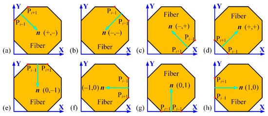 Schematic diagram of the inner normal direction at each point Pi. (a) n (+, −); (b) n (−, −); (c) n (−, +); (d) n (+, +); (e) n (0, −1); (f) n (−1, 0); (g) n (0, 1); (h) n (1, 0).