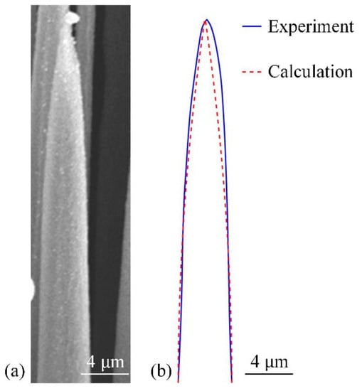 To verify the correctness of our model, we analyzed fiber morphology after oxidation at 1200 °C for 15 min by scanning electron microscope (SEM), as shown in Figure 7a. When the material and environmental parameters were η = 600 and χ = 3.5 × 10−7 m, the calculation results for the fiber were in good agreement with the experimental results, as shown in Figure 7b. The fiber heights of the experimental and calculated results were 29.83 and 29.97 μm, respectively. The error of fiber height was approximately 0.46%. The fiber contour areas of the experimental and calculated results were 95.11 and 87.47 μm2, respectively. The error of fiber contour areas was approximately 8%, representing a verification of the 2D results. There were several potential causes of error: (1) It is impossible for the fibers to be completely consistent from top to bottom; (2) SEM results can only extract two morphologies, which may be composed of the vertices of other point morphologies, and the left and right morphologies may have been truncated; (3) there were errors in fiber contour extraction; (4) There was deviation in parameter selection; etc.