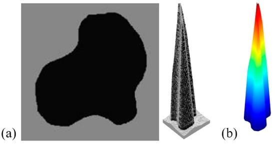 When the material and environmental parameters were η = 20 and χ = 5 × 10−3 m, the calculation results for the concave complex-fiber cross section are shown in Figure 8b. When compared with the calculation results of the Brownian motion simulation, as shown in Figure 8a, it can be seen that the calculation method in this study produced accurate results. It is worth pointing out that the number of fiber data points in the calculation result was 3321 × 251. The computational time using the calculation method proposed in this study was only approximately 58.55 s, approximately 1475 times faster than the Brownian motion simulation method proposed by Lachaud (approximately 24 h [43]). This is because the calculation method proposed in our study only needs to calculate one line and place it by coordinate transformation, without gradually evolving from the 3D initial state to the steady state over time. The computational complexity of the calculation method proposed in this study is approximately N, much smaller than that of the Brownian motion simulation method (approximately N4).