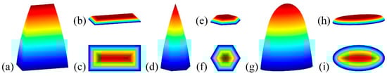 As shown in Figure 10, the effect of different parameters on the steady-state ablation morphology of rectangular, hexagonal, and elliptical cross sections was similar to that for the circular fiber cross sections. Based on the analysis of Figure 4c and Figure 10c,f,i, it is reasonable to define the characteristic length lc. The maximum characteristic length lc,max was 2 × 10−4 m, indicated in Figure 10. The maximum heights of the different cross-sections were the same: zmax = 9.83 × 10−4 m in Figure 10a,d,g, and zmax = 7.50 × 10−5 m in Figure 10b,e,h. Thus, the maximum characteristic length lc,max of the cross section determined the morphology height when the material and environmental parameters were the same. Fiber bundles of braided composites are likely to present rectangular and elliptical cross sections. The platform shapes (Figure 10b,e,h) were common to the steady-state ablation morphologies of the observed fiber bundles.