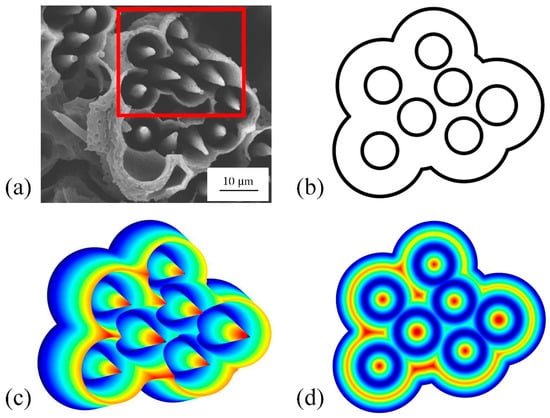 Comparison of experimental observation with the steady-state ablation morphology of C/C composites: (a) SEM morphology of C/C composite (reprinted/adapted with permission from Hindawi, 2017 [31]); (b) C/C composite section; (c) C/C composite morphology by calculation; (d) equipotential map of the C/C composite morphology by calculation.