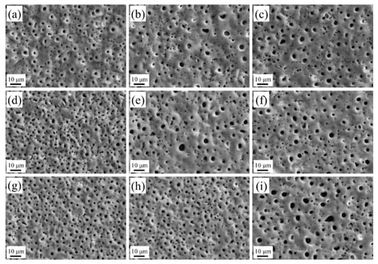 Surface morphologies of MAO coatings fabricated by nine processes: (a) No. 1, (b) No. 2, (c) No. 3, (d) No. 4, (e) No. 5, (f) No. 6, (g) No. 7, (h) No. 8, and (i) No. 9.