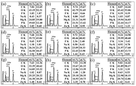 As shown in Figure 1, it was evident that MAO coatings fabricated by nine processes displayed typically porous characteristics due to spark discharge (Figure 1a–i). Anodic coatings developed on samples No. 4, No. 7, and No. 8 exhibited uniform characteristics, with pore sizes in the range of 1 to 4 μm (Figure 1d,g,h), while most micropores on samples No. 5 and No. 9 (especially No. 9) were larger than 5 μm in diameter (Figure 1i). According to EDS spectra, anodic coatings developed on nine samples were mainly composed of C, O, F, Na, Mg, P, and Zn elements (Figure 2). It was clear that the coating compositions were closely related with processing parameters. Sample No. 3 achieved the highest Zn amount, i.e., 4.12 wt.%, while sample No. 9 had the lowest Zn amount, i.e., 1.42 wt.% (Figure 2i).