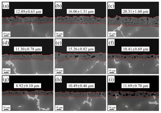 According to the cross-sectional morphologies shown in Figure 3, samples No. 4 and No. 8 exhibited a comparatively uniform and porous microstructure (Figure 3d,h), while many micropores were developed on other samples, especially sample No. 9. The thicknesses of anodic coatings developed on samples Nos. 1–9 were 12.89 ± 0.63, 16.06 ± 1.31, 20.31 ± 1.60, 11.30 ± 0.78, 15.26 ± 0.82, 10.41 ± 0.69, 8.92 ± 0.10, 10.49 ± 0.46, and 11.69 ± 0.70 μm (Figure 3a–i), respectively. Among these samples, the anodic coating on samples No. 3 was the thickest, i.e., 20.31 ± 1.60 μm. However, sample No. 7 achieved the thinnest coating, only 8.92 ± 0.10 μm (Figure 3g).