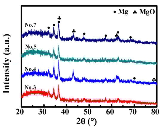 According to Figure 2, the Zn amounts on No. 3, No. 4, No. 5, and No. 7 were 4.12, 2.94 wt.%, 1.44 wt.%, and 1.48 wt.%, respectively. The XRD spectra of the four MAO samples mentioned above are displayed in Figure 4. Anodic coatings mainly contained Mg phase and MgO, while P-containing or F-containing crystalline components were not found, indicating that these substances existed mainly in amorphous state. The diffraction peaks of the WE43 substrate were detected, and they could be attributed to thin and porous MAO coatings.