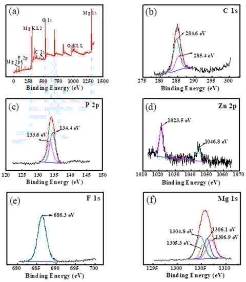 XPS spectra of sample No. 4: (a) survey spectrum, (b) C 1s, (c) P 2p, (d) Zn 2p, (e) F 1s, and (f) Mg 1s.