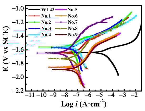 The potentiodynamic polarization curves measured in Hanks’ solution of WE43 substrate and nine MAO samples prepared in different solutions based on the orthogonal experiment.