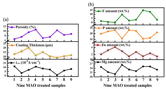 Figure 7 shows the icorr values, thickness; porosity; and chemical compositions, including F, P, Zn, and Mg amounts of anodic coatings fabricated on MAO samples. The icorr values somewhat depend on, but not very monotonically, the thickness, porosity, or chemical composition of the MAO coatings, indicating that coating thickness, porosity, or composition was not the only important factor governing coating corrosion resistance. In other words, coating corrosion resistance was jointly determined by surface characteristics. It was clear that the P amount was negatively correlated with the F amount, indicating that P and F competed to take part in coating formation (Figure 7b). Except for samples No. 5 and No. 9, the Mg amount was also negatively correlated with the Zn amount (Figure 7b), which could be attributed to their competition to combine with PO43− into phosphate salts.