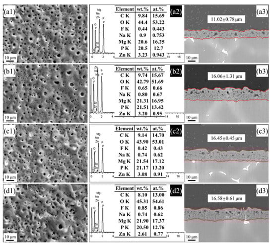 Figure 8 shows surface characteristics of the anodic coatings prepared in solution No. 2 under different treatment times. According to the surface morphologies, all MAO coatings were rough with porous characteristics, and there were not any obvious differences in pore size or porosity. However, with the prolonged treatment time, the coating surface became rougher (Figure 8(a1–d1)). As shown in Figure 8(a2–d2), the prepared coatings mainly contained C, Na, F, Mg, O, Zn, and P elements. The Zn amounts in prepared anodic coatings with treatment times of 2.5, 3.0, 3.5, and 4.0 min were 3.23, 3.20, 3.08, and 2.61 wt.%, respectively, exhibiting a slightly decreased trend. According to cross-sectional morphologies shown in Figure 8(a3–d3), the thicknesses of MAO coatings prepared with treatment times of 2.5, 3.0, 3.5, and 4.0 min were 11.02 ± 0.78, 16.06 ± 1.31, 16.45 ± 0.45, and 16.58 ± 0.61 μm, respectively, showing that extended treatment time could gradually increase coating thickness.