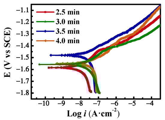 Potentiodynamic polarization curves of treated samples in solution No. 2 with treatment times of 2.5, 3.0, 3.5, and 4.0 min are shown in Figure 9. According to the obtained corresponding electrochemical parameters listed in Table 4, with the prolongation of treatment time, the icorr values slightly increased, indicating that the prolonged treatment time was unfavorable for coating corrosion resistance.