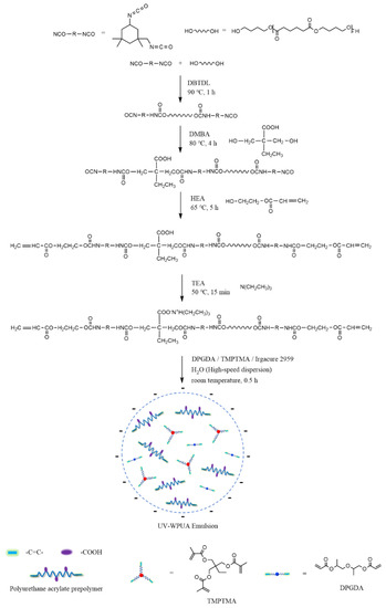 According to the scheme shown in Figure 1, the UV–WPUA emulsion was synthesized in 5 steps.