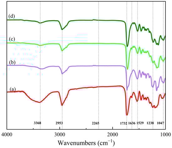 The absorption peaks at 3368 cm−1 (stretching vibration of –N–H), 1529 cm−1 (bending vibration of –N–H), 1732 cm−1 (stretching vibration of C=O), 1047 cm−1, and 1238 cm−1 (symmetric stretching vibration and asymmetric stretching vibration of C–O–C) exist in all spectra, indicating that –NCO reacts with –OH to form carbamate groups. Simultaneously, the absorption peak at 2265 cm−1 (stretching vibration of –NCO) only appears apparently in the IPDI spectrum, which proves a sufficient reaction between –NCO and –OH [19].