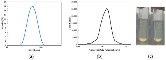 The particle–size distribution and zeta potential of the emulsion were measured using a Nano ZS instrument (Malvern Instrument Co., Ltd., Malvern, PA, UK). The emulsion stability was measured using a TG–16 high–speed centrifuge (Xiangyi Instrument Co., Ltd., Xiangtan, China) under 3000 rpm for 15 min. If there were no signs of precipitation after centrifugation, the emulsions could be evaluated with a shelf life longer than six months [18].