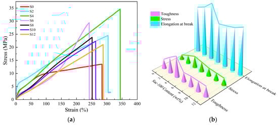 With the increase of the Sac–100 content from 0 wt% to 4 wt%, the tensile strength, elongation at break, and toughness increase first and reach their maximum values of 34.58 MPa, 343.64% and 65.08 MJ/m3, respectively. More Sac–100 will lead to decreasing of all three parameters. The results show that the appropriate content of Sac–100 (4 wt%) can simultaneously improve the tensile strength and the elongation at break of the WPUA films, resulting in a toughening effect. However, due to the limited carboxylic groups in the system, when the dosage of Sac–100 exceeds 6 wt%, excessive addition results in the deterioration of the mechanical properties.