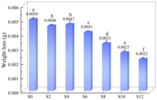 The weight loss of the coatings with different Sac–100 contents in the wear test are shown in Figure 9. As the Sac–100 content increases from 0 wt% to 12 wt%, the weight loss decreases from 5.0 mg to 2.2 mg, and the wear resistance gradually improves, because a large number of Sac–100 molecules interspersed in the crosslinked network endure certain intrinsic stress.