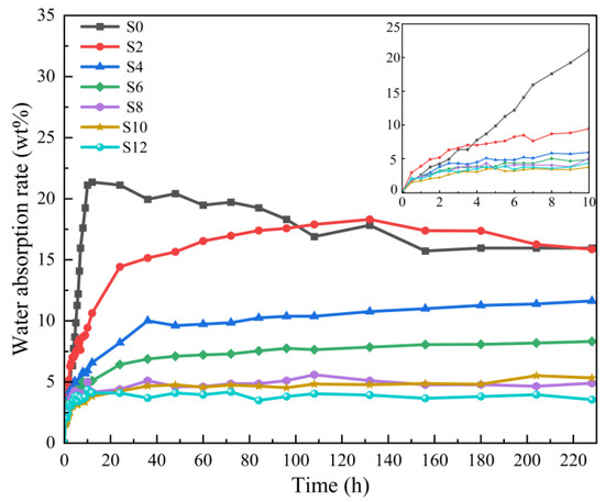 Figure 10 and Table 2 show the effect of the Sac–100 content on the water–absorption ratio of WPUA films. With the increase of the Sac–100 dosage from 0 wt% to 12 wt%, the equilibrious water–absorption ratios decrease from 15.96 wt% to 3.55 wt%, indicating that the water resistance of the films has gradually improved. This is because Sac–100 reacts with carboxylic groups in the WPUA chains to form the crosslinking network, which not only effectively prevents the hydration caused by carboxyl groups, but also increases the crosslinking degree of the cured film, therefore slowing down the penetration of the water molecules [25,26].