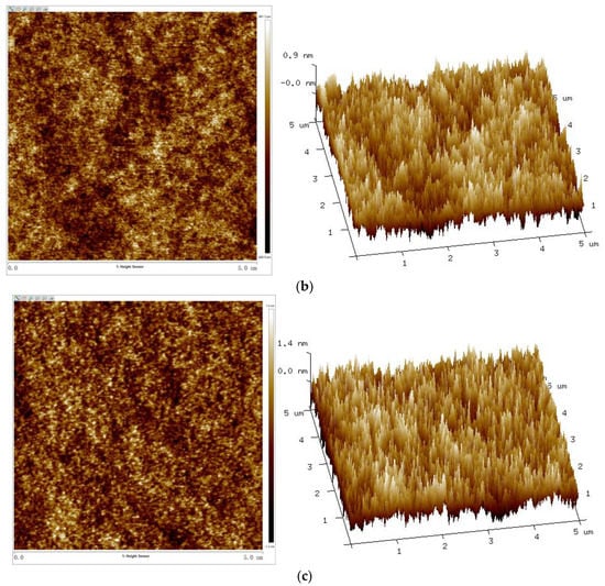 With the increase of the Sac–100 content from 0 wt% to 6 wt%, the crosslinking of the cured films becomes denser and tighter, which reduces the degree of phase separation of the WPUA chains and the shrinkage during the UV curing, so all the roughness parameters, including the root mean square roughness (Rq), average roughness (Ra), and maximum roughness (Rmax), decrease. However, when the aziridine content is too high, the excess aziridine cannot crosslink with the limited carboxylic groups but can affect the uniformity and consistency of the cured films. Therefore, from the point of film smoothness, the preferred Sac–100 content is 6 wt%.