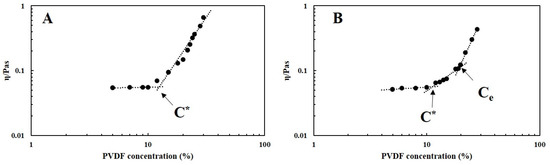 Viscosity (Pa·s) of the polymer solutions (A) PVDF in DMF, (B) PVDF in DMF/acetone—2/3) vs. PVDF concentration (w/v%) (circles correspond to experimental points).