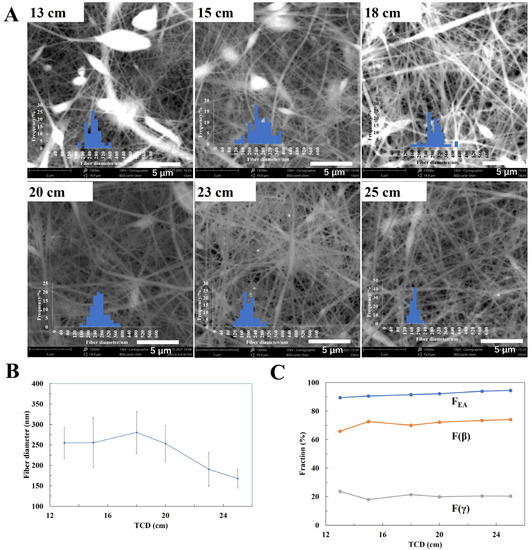 (A) SEM images and nanofibers diameter distribution, (B) mean nanofiber diameter, and (C) FEA, F(β) and F(γ) of PVDF nanofibers for different TCD values (25 w/v% PVDF, DMF/acetone = 2/3, TCD = 13–25 cm, FR = 1 mL/h, V = 20 kV).