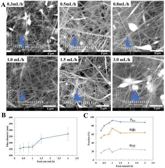 The feed rate is another factor that affects the stretching of the polymer jet. Figure 6 shows different electrospinning PVDF nanofibers obtained by changing the feed rate (0.3–3 mL/h) at the same voltage. The structure of PVDF nanofibers is shown in Figure 6A. The SEM images show significant beads structure at low (0.3 mL/h) and high (3 mL/h) feed rates. Additionally, with the increase in feed rate, the fiber diameter shows a trend of increasing (Figure 6B). By comparing the electroactive phases of PVDF nanofibers obtained with different feed rates (Figure 6C), it is found that as the feed rate increases, the electroactive phase, especially the β phase, shows a trend of first increasing and then decreasing. This is because under the same voltage, as the feed rate increases, the stretching effect of the electric field on the polymer jet decreases [51]. When the feed rate is minimal (0.3 mL/h), similar to the use of too high a voltage for electrospinning, the excessive stretching of the polymer jet by the electric field leads to the instability of the polymer jet. Although the nanofiber diameter is reduced, it is not conducive to forming the electroactive phase (FEA = 68.3 ± 1.2%). As the feed rate increases, the flow of the polymer jet tends to be stable, which leads to an increase in the electroactive phase. When the electroactive phase of PVDF reaches the peak value (1 mL/h, 92.4% ± 0.8%), further increasing the feed rate causes the electroactive phase to decrease because the flow of the polymer jet has stabilized; continuing to increase the feed rate only weakens the stretching effect of the electric field on the polymer jet, which eventually leads to a decrease in the electroactive phase.